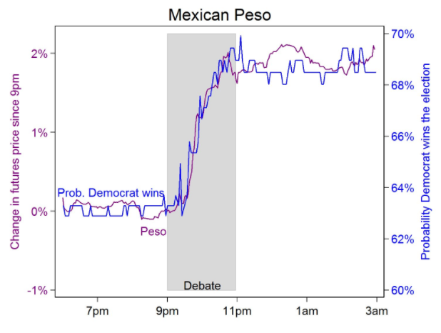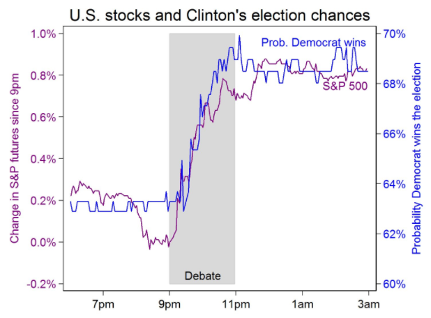 According to a new paper by Justin Wolfers, an economist at the University of Michigan, and Eric Zitzewitz, an economist at Dartmouth College, Clinton’s victory triggered the financial equivalent of a worldwide happy dance. Soon after the debate ended, stock markets celebrated the news of Trump’s loss. Markets in the U.S., U.K., and Asia soared, the price of crude oil rose, and the currencies of America’s closest trading partners, such as Mexico and Canada, ticked up as well. It was “the most consequential single event (so far!) during the 2016 general election campaign,” they wrote.