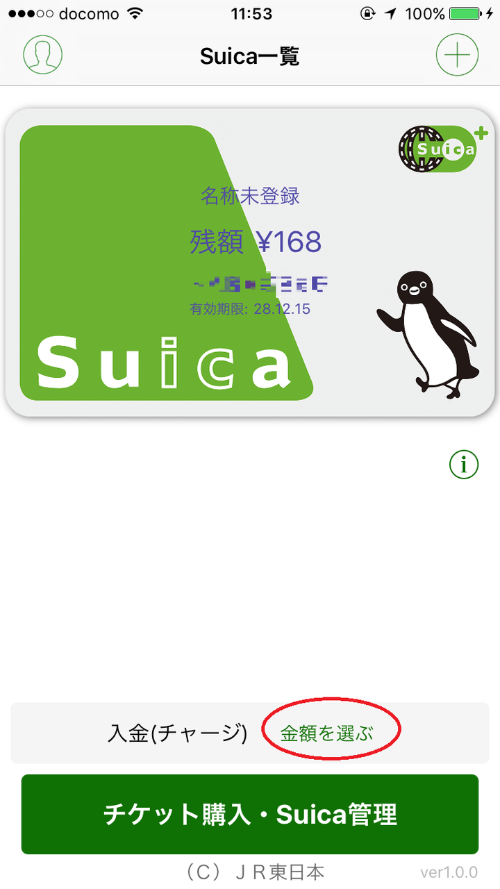 Suicaアプリを起動すると、先ほど移行したSuicaの券面と定期券の場合はその情報が出てきます。クレジットカードを登録する場合には「入金(チャージ)」の右側にある「金額を選ぶ」をタップします。