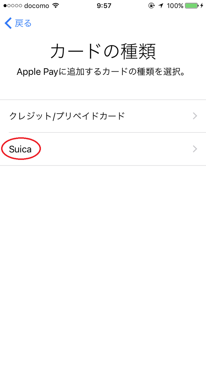 すると、「クレジットカード/プリペイドカード」および「Suica」の選択肢がありますので、「Suica」をタッチします。