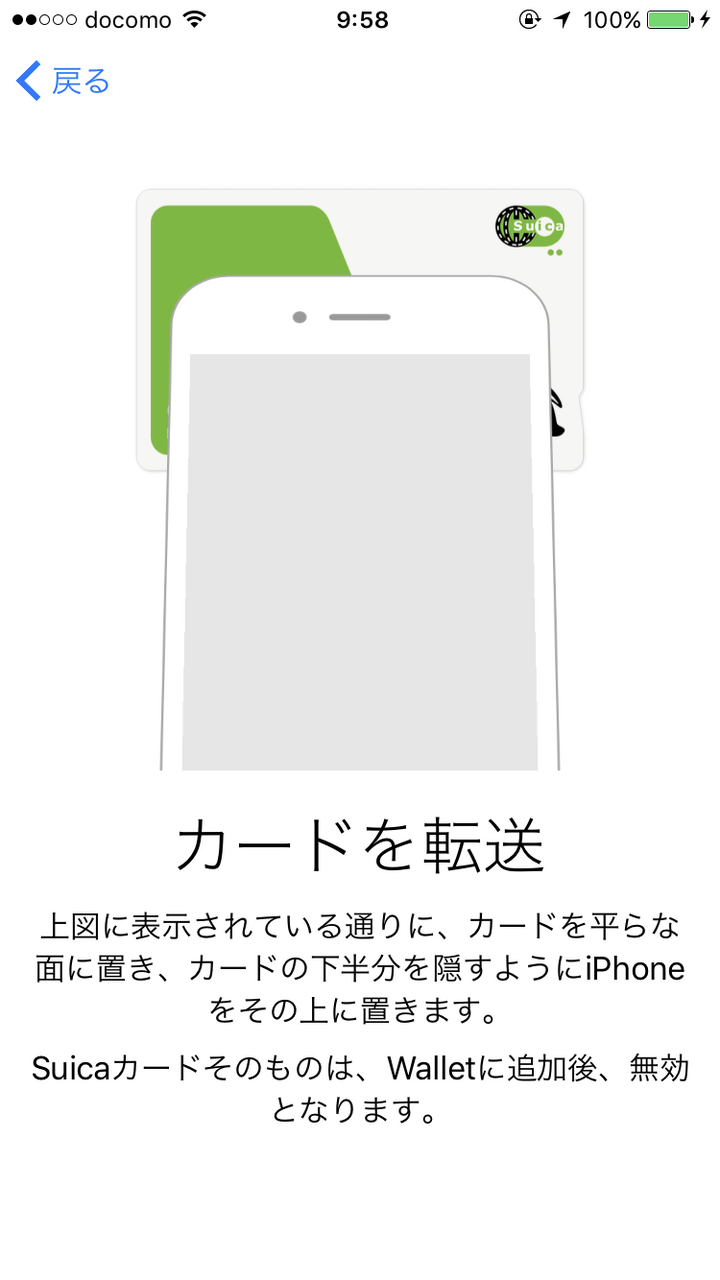 そこでこの画面が出てきたら、Suicaの上にiPhoneの上部を重ねるように置きます。すると、自動で転送が自動的に開始され、Apple PayにSuicaが追加されます。なお、移行すると今まで使用していたプラスチックカードは使用不可能になるので注意が必要です。