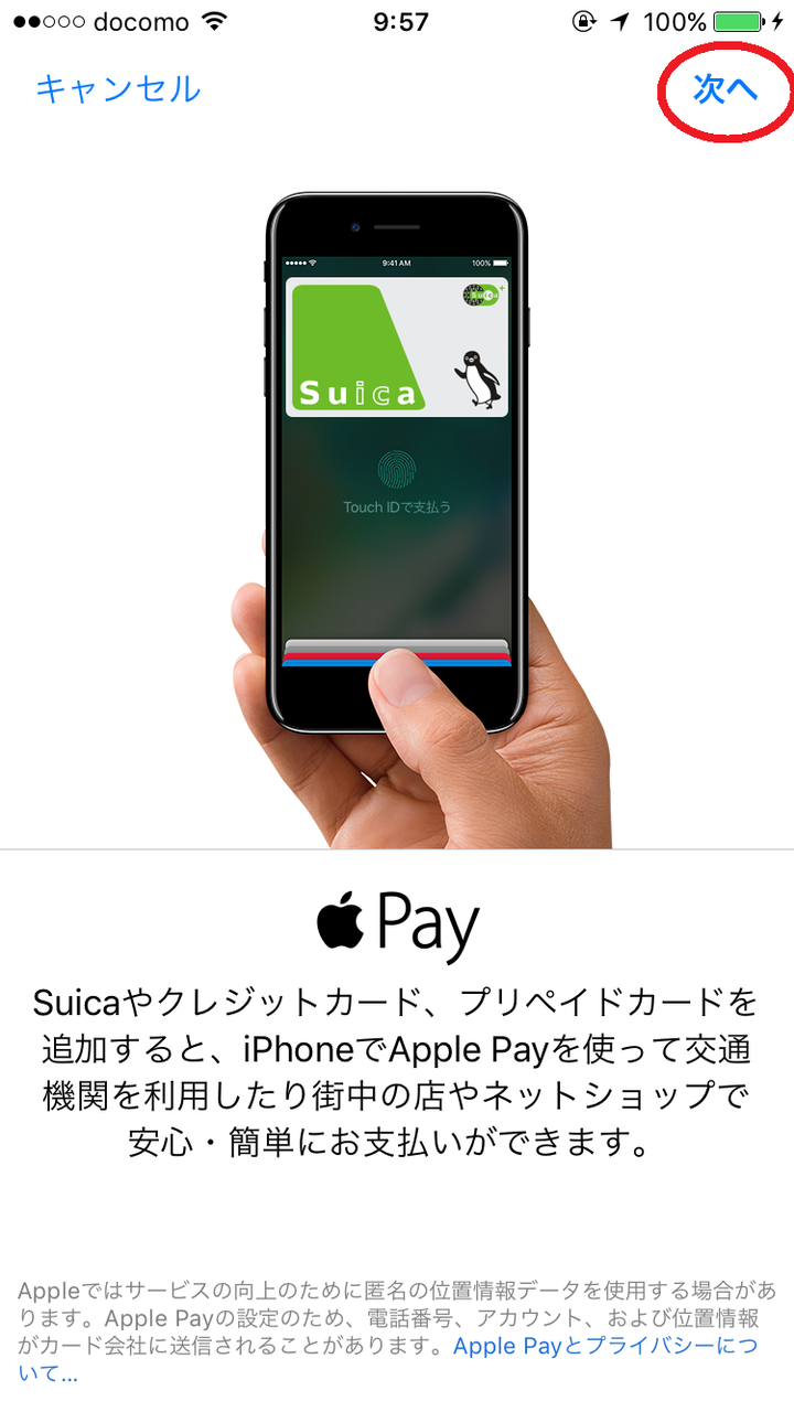 Apple Payの簡単な紹介が出てきますので右上の「次へ」をタップします。