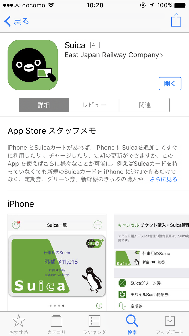 続いて「App Store」から「Suica」と検索すると、JR東日本が提供している「Suica」アプリが出てきますので、インストールします。Apple Payの日本でのサービス開始に合わせてリリースされました。
