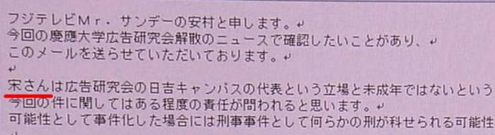 宋さんは広告研究会の日吉キャンパスの代表という立場と未成年ではないということで、今回の件に関してはある程度の責任が問われると思います。