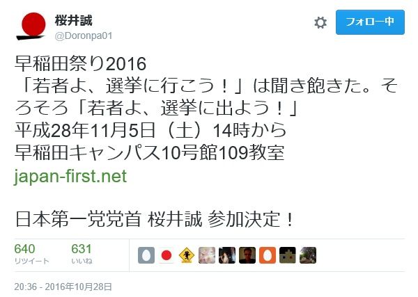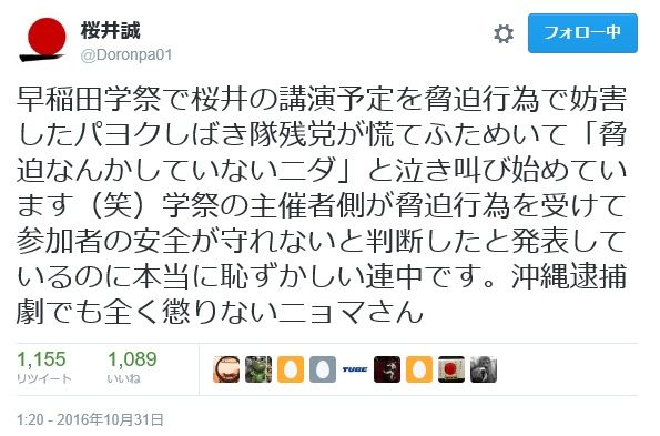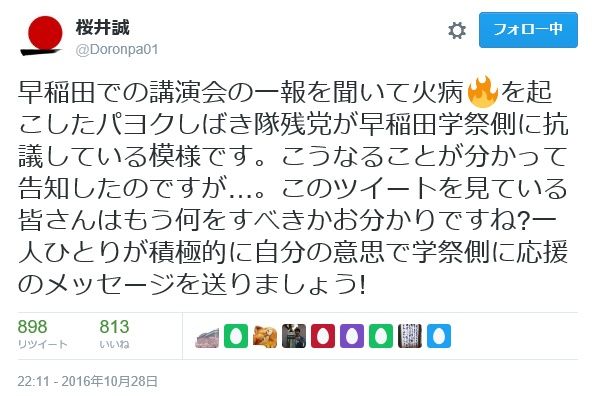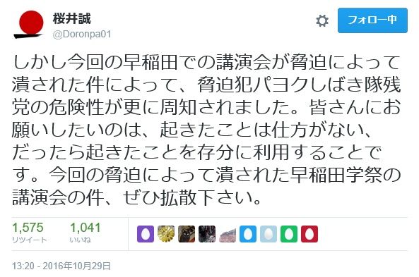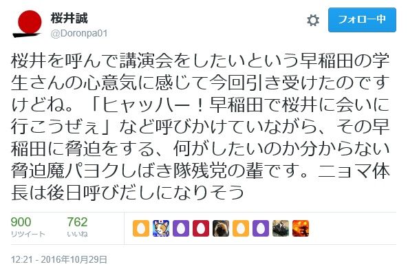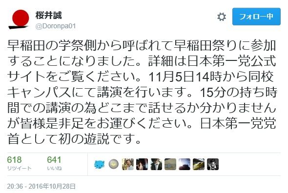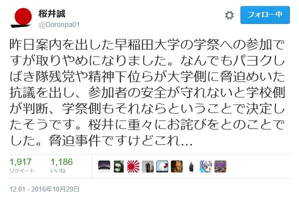 以下、桜井誠氏のツイートより早稲田学際での講演決定と中止までのプロセスを振り返ってみよう!