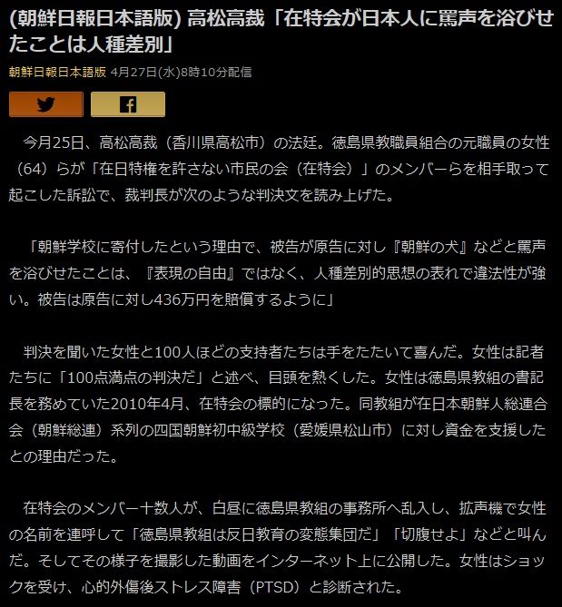 最高裁第3小法廷の大谷剛彦裁判長は11月2日、在特会側の上告を棄却。二審の高松高裁が「在特会側の活動は人種差別的な思想に表われに他ならず、違法性は強い」として約430万円の賠償を命じた判決が確定する。