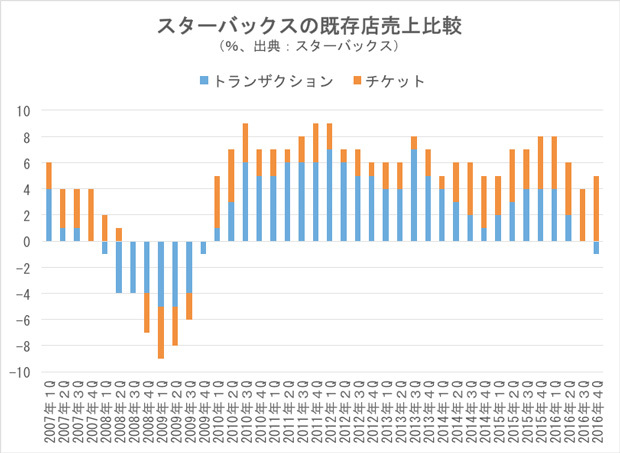 トランザクションが落ち込んでいる一因は、「スターバックス・カード」でフリー・ドリンクが貰える条件を、これまでの「10回購入すれば1ドリンク」から「一定の金額に達すれば1ドリンク」に改めたことにあります。