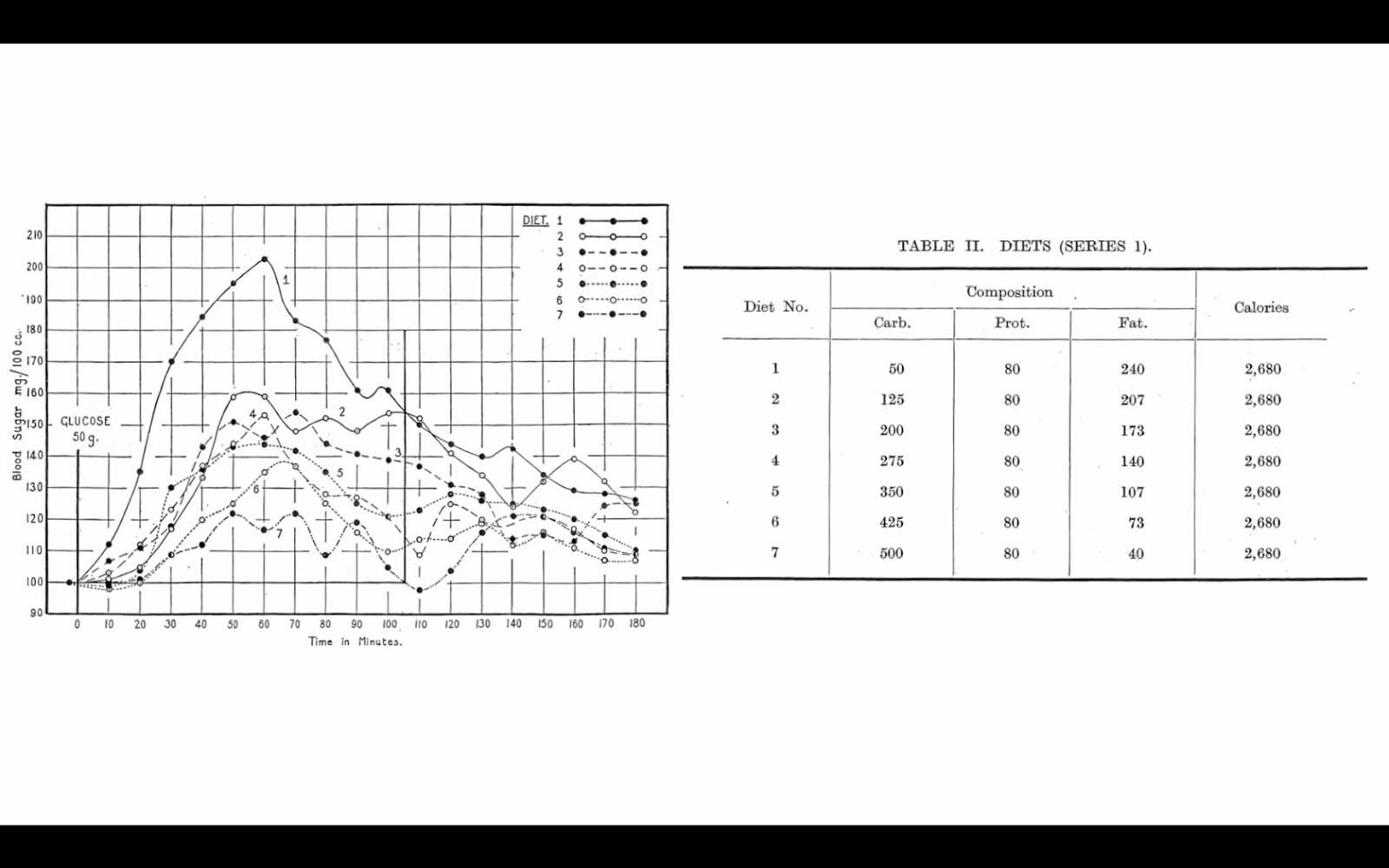 の7パターンでダイエットを行ってもらいます。そしてダイエット終了後、50gのブドウ糖を摂取して、その後の血糖値の上がり方を調べました。