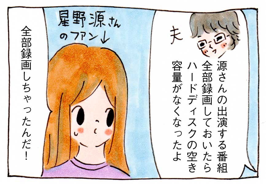 2016年11月15日 源さんの番組を全録する夫 私は星野源さんのファンです。夫が、源さんの出演する番組を全部録画しておいたらハードディスクの空き容量がなくなったよ、といいました。私は源さんのファンですが、観たい番組は自分のハードディスクに録画していますし、もともと録画を夫に頼んでいなかったので「もう録画しなくていいから」といいました。でもそれにも関わらず夫は、今週も源さんを全録しているようでした。私のために録画しているという夫ですが、内心「これは絶対ファンでしょ」と思う私でした。ちなみに夫が録画した源さんもので私が観せてもらった回数は1、2回くらいです(汗) *PR*ブログが本になりました! 「雑談」カテゴリの最新記事 Tweet < 前の記事 ※コメントはTwitterまでどうぞ。↓ Follow @hitamuimaizumi @hitamuimaizumiさんのツイート