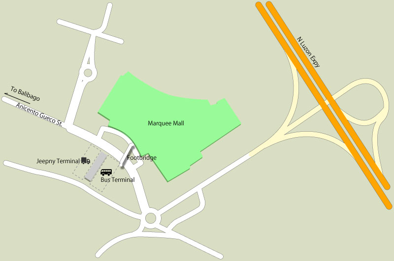 パサイのバスターミナル、Marquee Mall、DAUバスターミナル、フィールズアベニューの位置関係です。