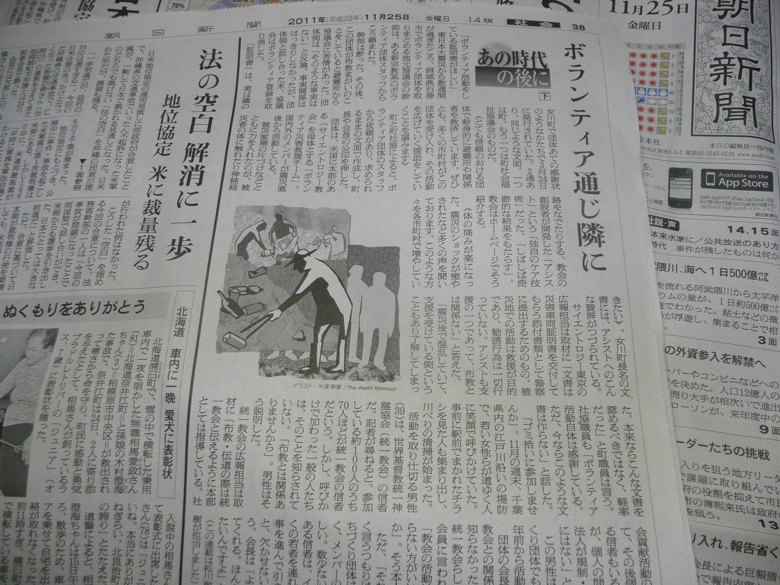 朝日新聞【あの時代の後に】『ボランティア通じ隣に』の記事では、宮城県石巻市でのサイエントロジー教会の活動についても、避難所から“布教まがいのことをしている”との苦情があったことや《とても信頼のおける団体で献身的に避難所や関係者を救済しています。ぜひとも、多くの市町村がこの団体を受け入れ、その活動を広げていく援助をしていくことを望みます》との文面の感謝状のようなかたちの“ボランティア活動をしている証明書”を教会のボランティアスタッフが欲しがったことなどを記載している。