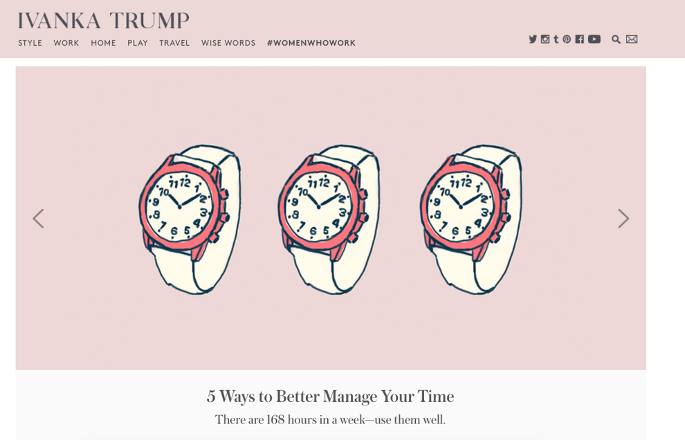 この目的に向かって、イヴァンカのサイトは、「より良い、素早い決断を下す5つの方法」や「旅行中にゲームを続けるための6つのコツ」「平日を元気に乗り切るための4つの作り置きおかず」といったハウツーものであふれている。 女性は誰からも好かれるようにふるまうべきという考え方に挑戦する代わりに、実際にそのような女性になるためにはどうするかについての #LifeHacks を与えているのだ。 「1週間は168時間あります」と、時間管理の投稿では 声高に宣言している。「時間を上手に使いましょう」