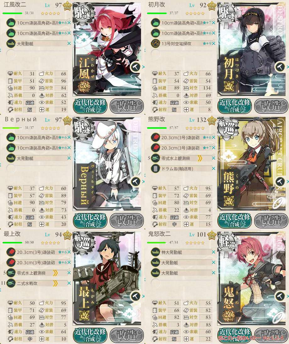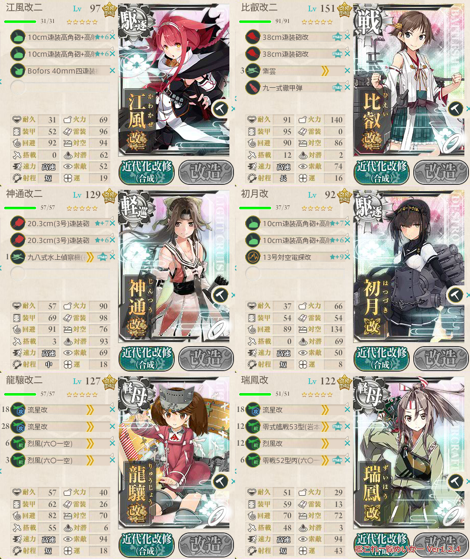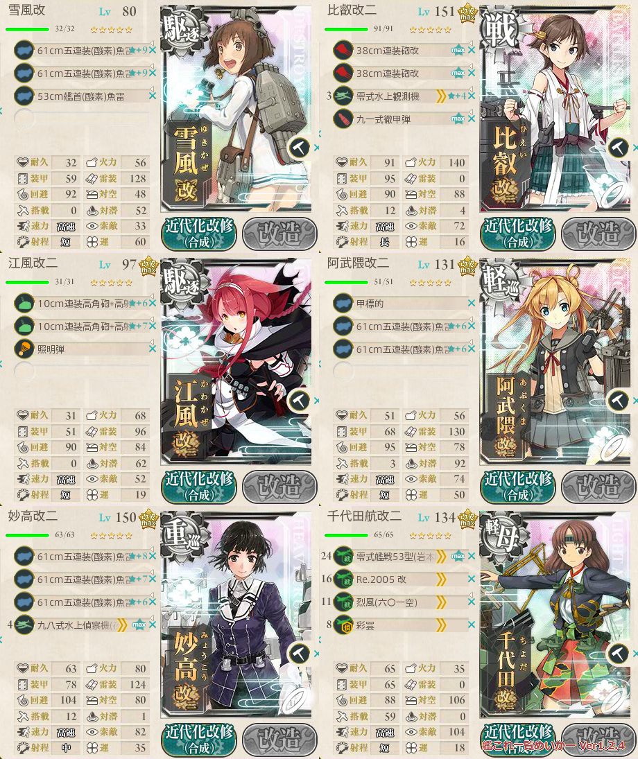 フラルのとこでT有利引いたせいでこうなりましたが、武蔵以外フルキラだったから避けた分も多かった。やっぱり沼ってる人はまずキラつけて複数回出撃しないとね。面倒だけどやっぱり大破で帰るよりよっぽどマシですしおすし