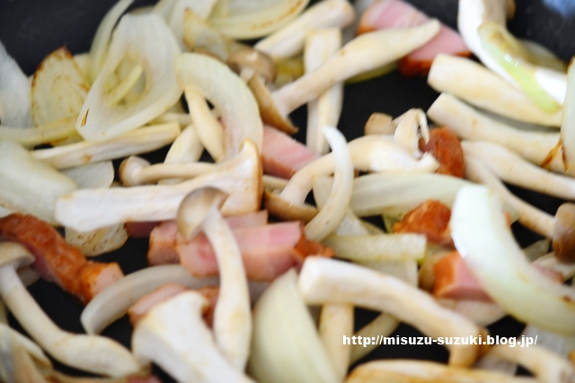 ③②にベーコン、人参、しめじを加え