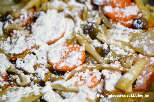 ⑤火を止め、薄力粉をまんべんなくふりかけ、