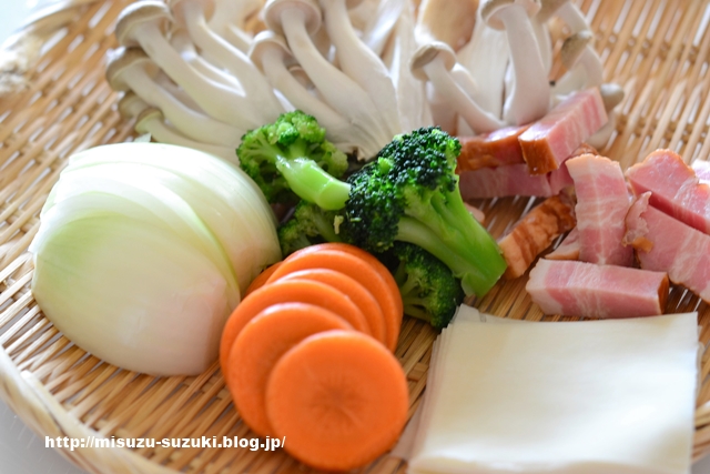 ①野菜、ベーコンは切る。ブロッコリーは解凍する。