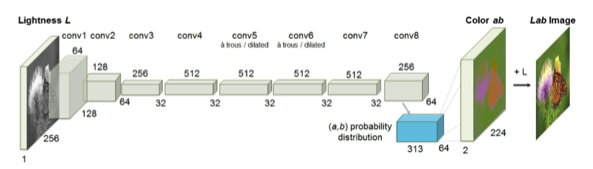 例えば上図は早稲田大学による、白黒画像をカラー化するためのニューラル・ネットワークだ。