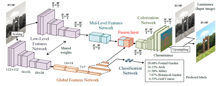 局所的特徴と大域的特徴を顧みながら、最終的にカラー画像を生成する。
