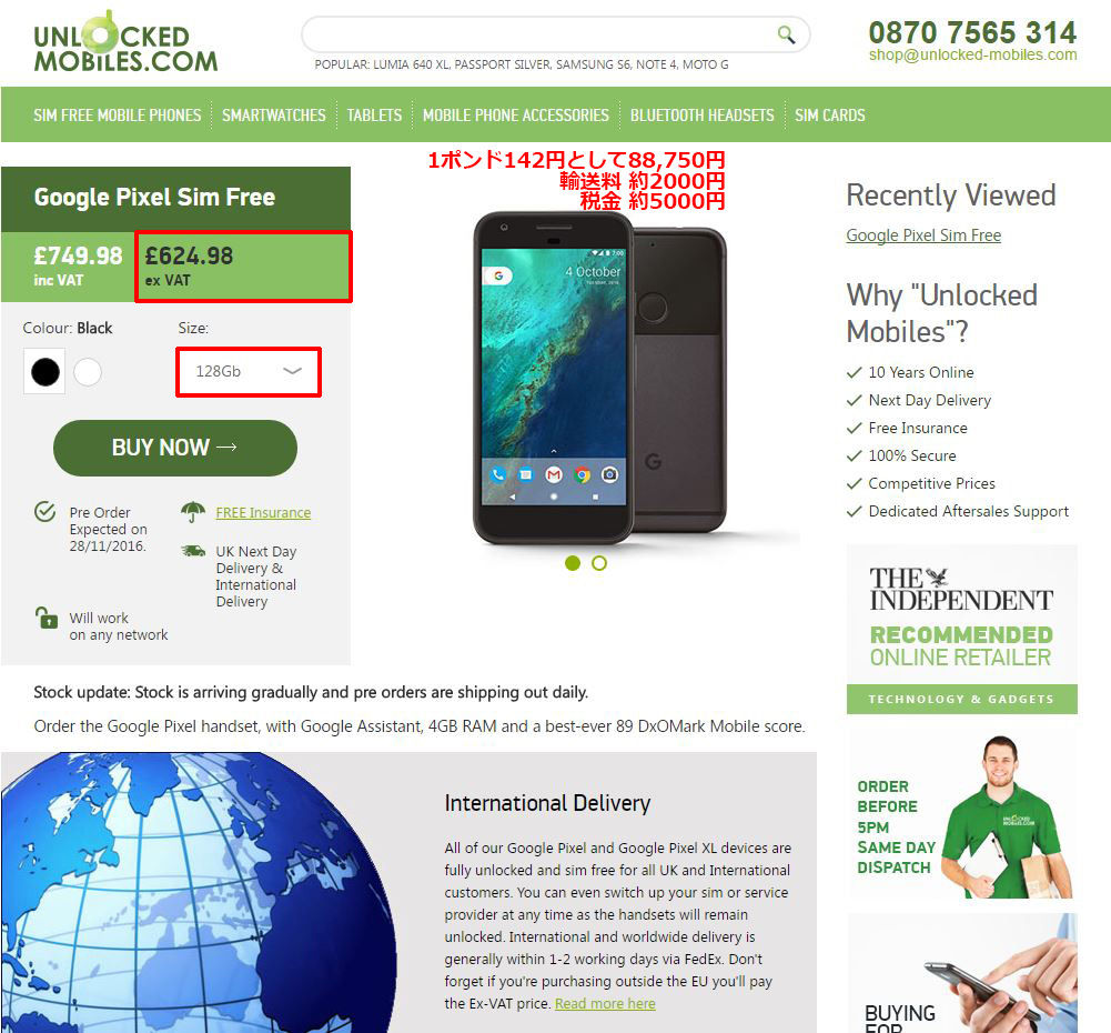 最後に掲載するのはUnlocked Mobile。最終支払金額は95,000円前後と最も安いが、自分は今まで利用したことがないので、サービス内容については不明だ。11月16日注文→11月26日発送などの書き込みを見ると、Google Pixelは在庫が全般的に不足気味で、潤沢には供給されていないらしい。