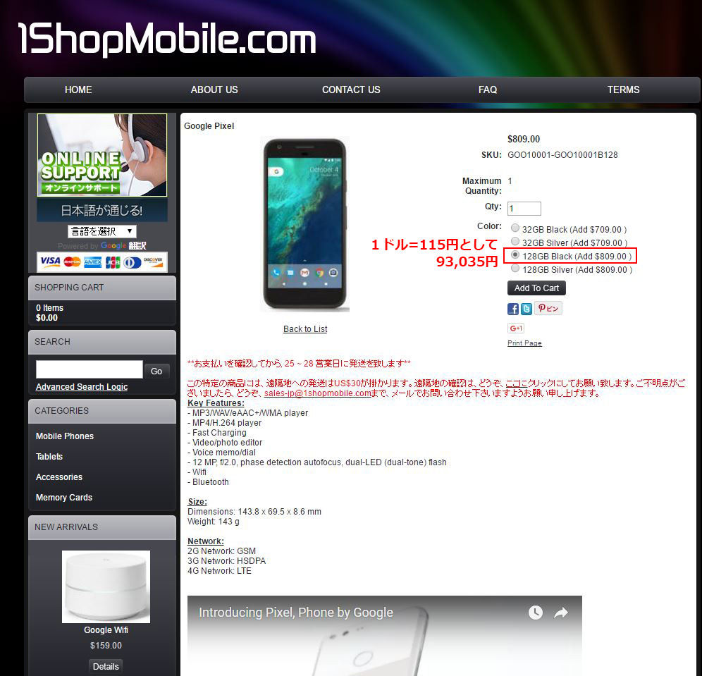続いて1ShopMobile.com。表示価格以外にかかる費用はこちらに掲載されているが、郵送料金と輸入消費税を加算すると円安の昨今、ひょっとしたら10万円を超えるかもしれない。米国トランプ新大統領の登場を背景に円安が進行し、ここしばらくは1ドル=110円が予想されるが、大統領就任後は円高?円安?は政策次第と見られているだけに予断を許さない。