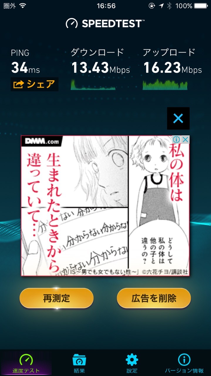 現地で速度測定したところ、最高値で下り13Mbpsであったが、電波が圏外である事を考えると十分な速度である。