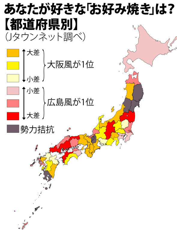 大阪風が1位だった府県は23あったのに対し、広島風が1位だった都道県は19。大票田の南関東(東京・神奈川・千葉)で広島風が大阪風を上回った。