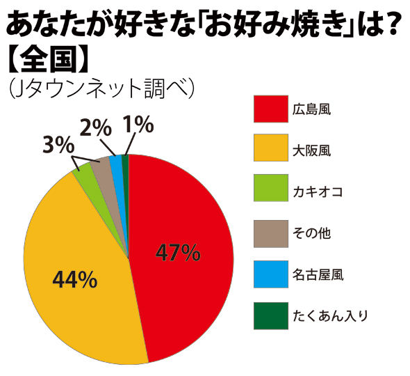 全体でみると、トップだったのは「広島風」の47%だったが、2位の「大阪風」とは3%の差しかなかった。それ以外は「カキオコ」が3%、「名古屋風」が2%、「たくあん入り」に至っては1%しかなかった。