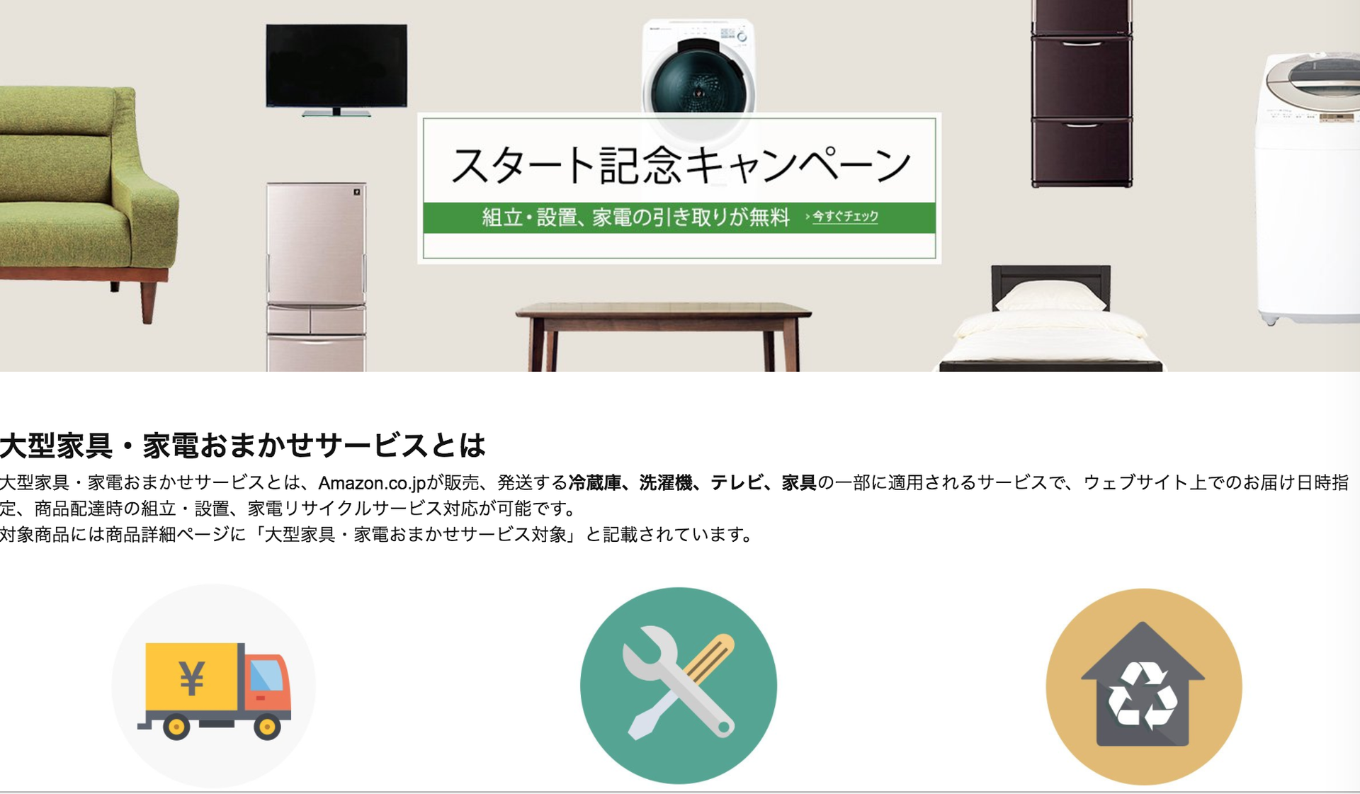 同サービスの対象商品には、商品詳細ページに「大型家具・家電おまかせサービス対象」と記載されている。なお、Amazonは同サービスのスタートを記念して、キャンペーンを開催。2017年3月31日までの期間中に、対象の大型商品の配送方法で日時指定便を選択して購入すると、組立・設置料金および家電リサイクルサービスの収集運搬料金が無料になる。