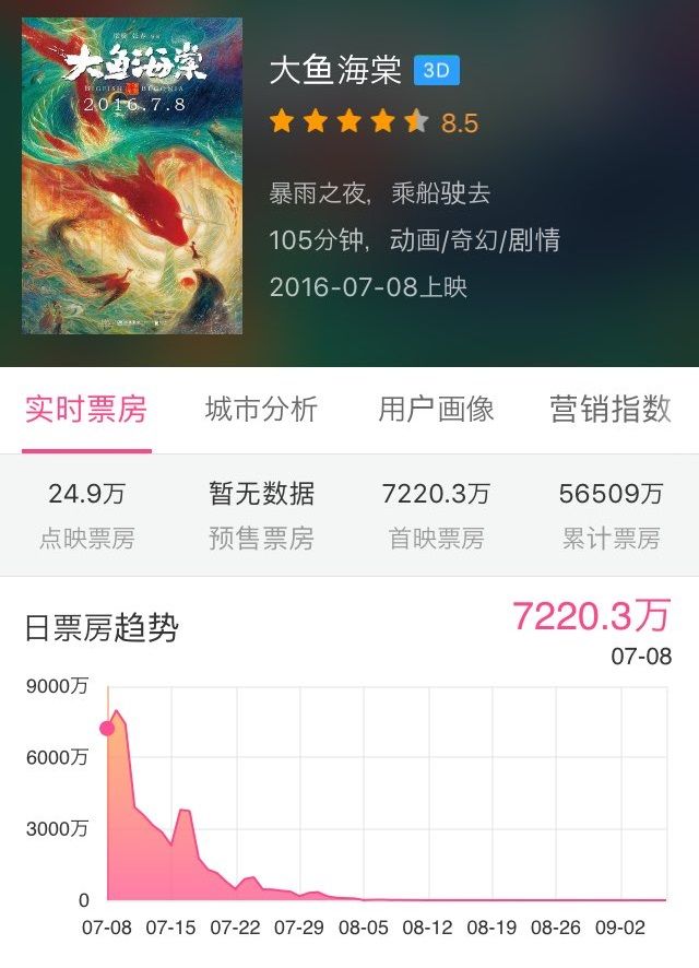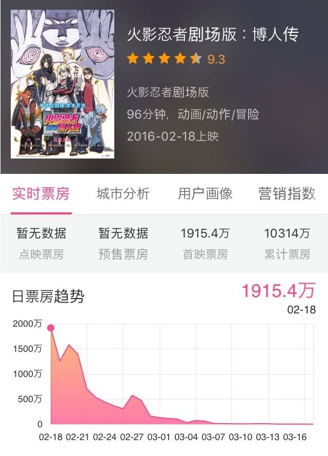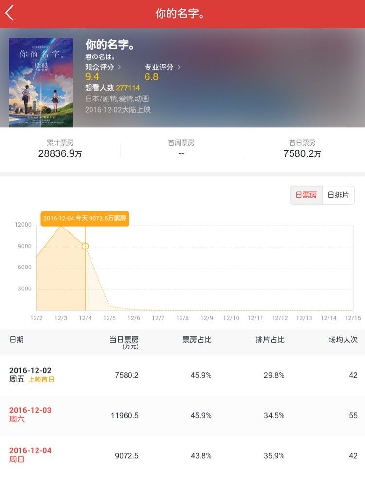 上映期間中に連休や長期休暇があれば別ですが、12月はそういうイベントがないので、「君の名は。」の最終興行収入は5〜6億元(80〜100億円)くらいかな?と。でもそれだけ上げるのも凄いですよ。ナルトやワンピという知名度の高い作品でも1億元(16億円)超くらいなんですから。