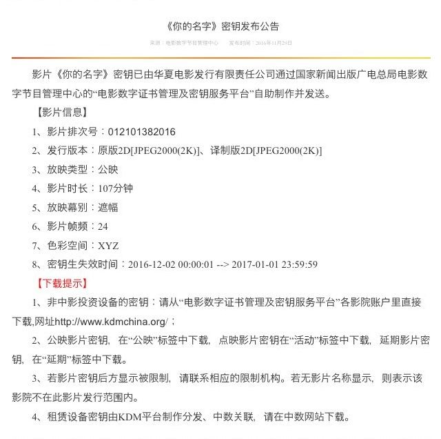 中国の映画上映期間は最大1ヶ月。『君の名は。』の場合は2017年1月1日の23時59分59秒までですが、これは映画のデジタルキー有効期限でもあるため、映画館によってはそれより早く終了してしまいます。第3週目以降は上映館自体が激減するので、中国で観賞予定の方は来週一杯が目処ですよ。 pic.twitter.com/wXvW5Y0lX4