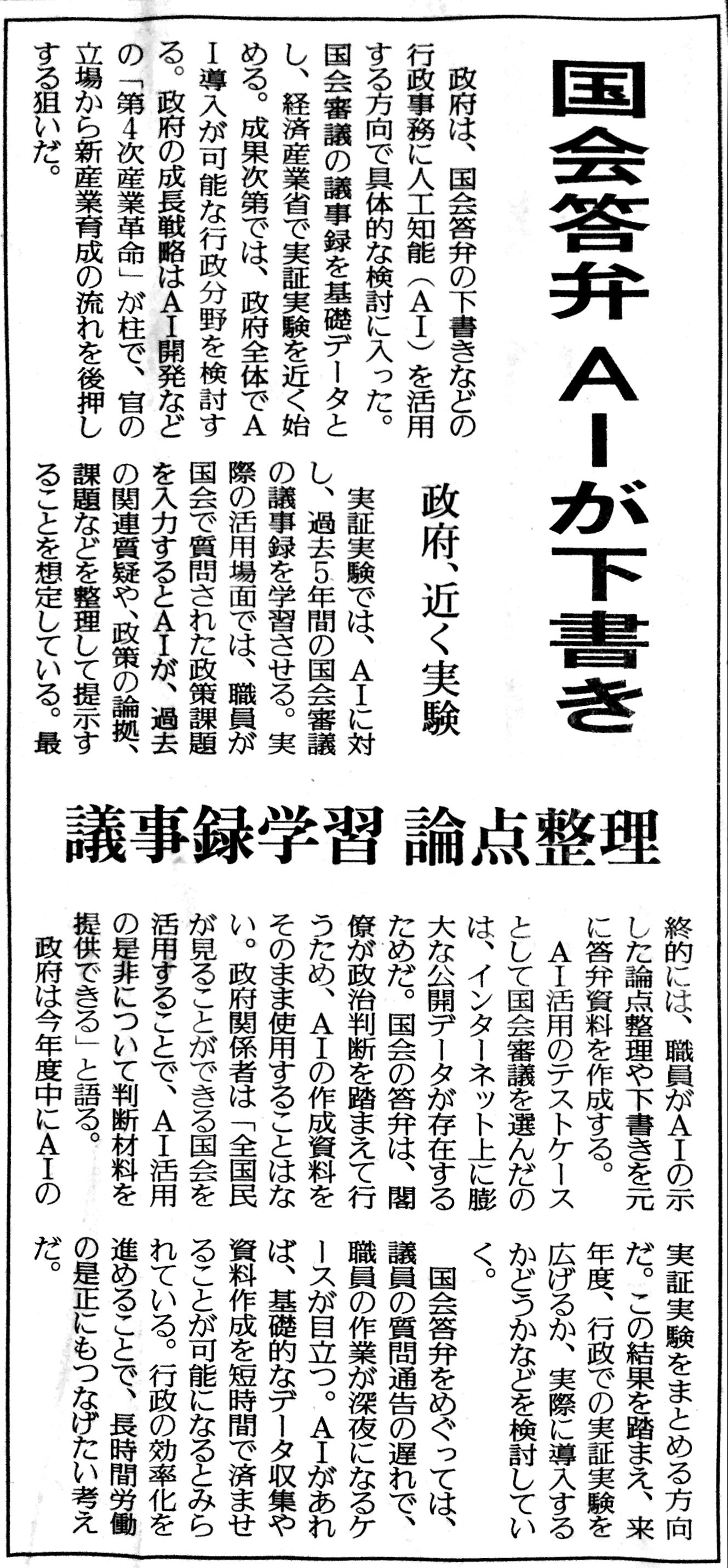 政府は、国会答弁の下書きなどの行政事務に人工知能(AI)を活用する方向で具体的な検討に入った。国会審議の議事録を基礎データとし、経済産業省で実証実験を近く始める。成果次第では、政府全体でAI導入が可能な行政分野を検討する。政府の成長戦略はAI開発などの「第4次産業革命」