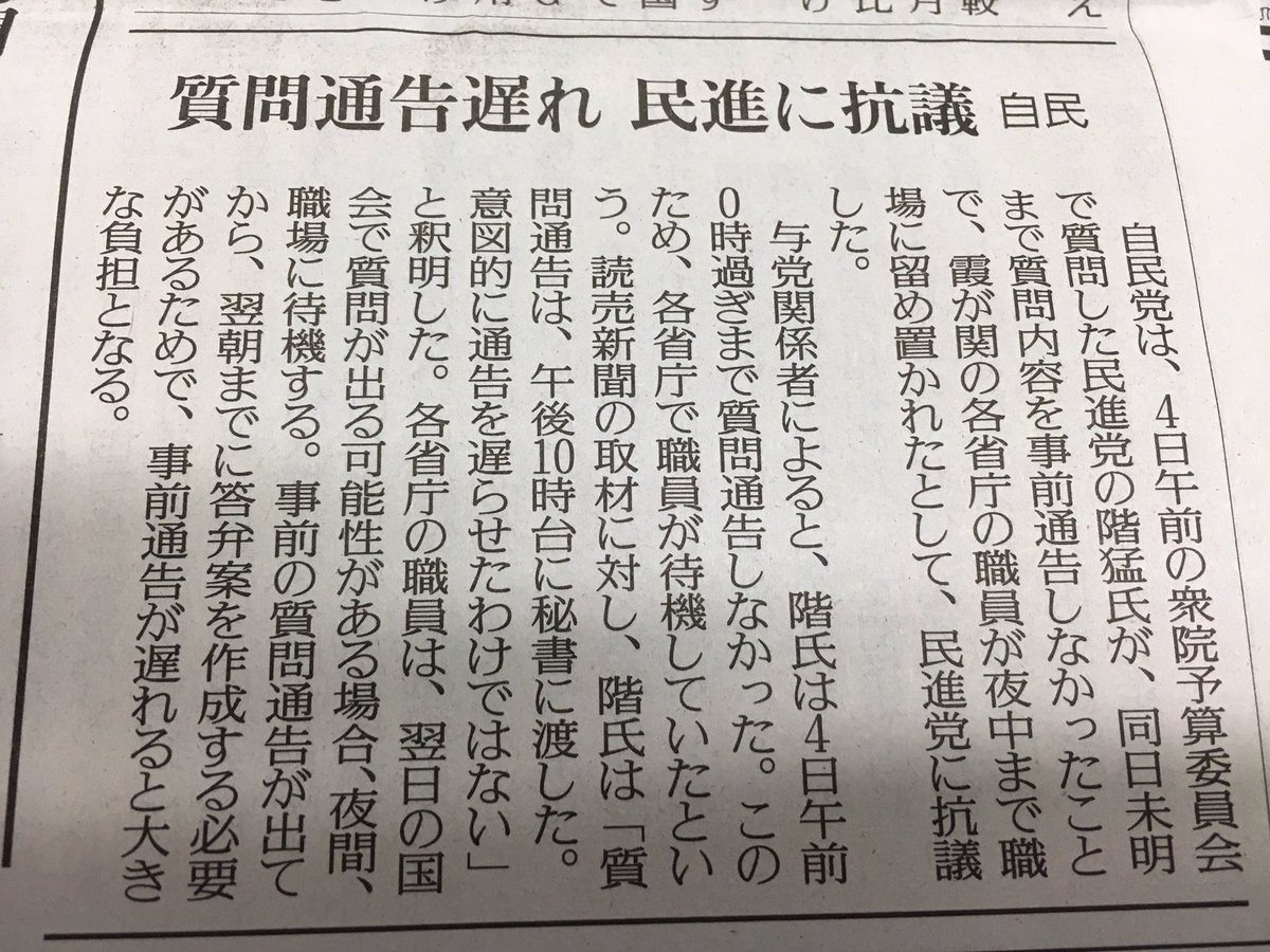 強い怒りを覚える。記事にある通り、民進党議員が一昨夜、翌日の質問通告を深夜0時過ぎに行った。