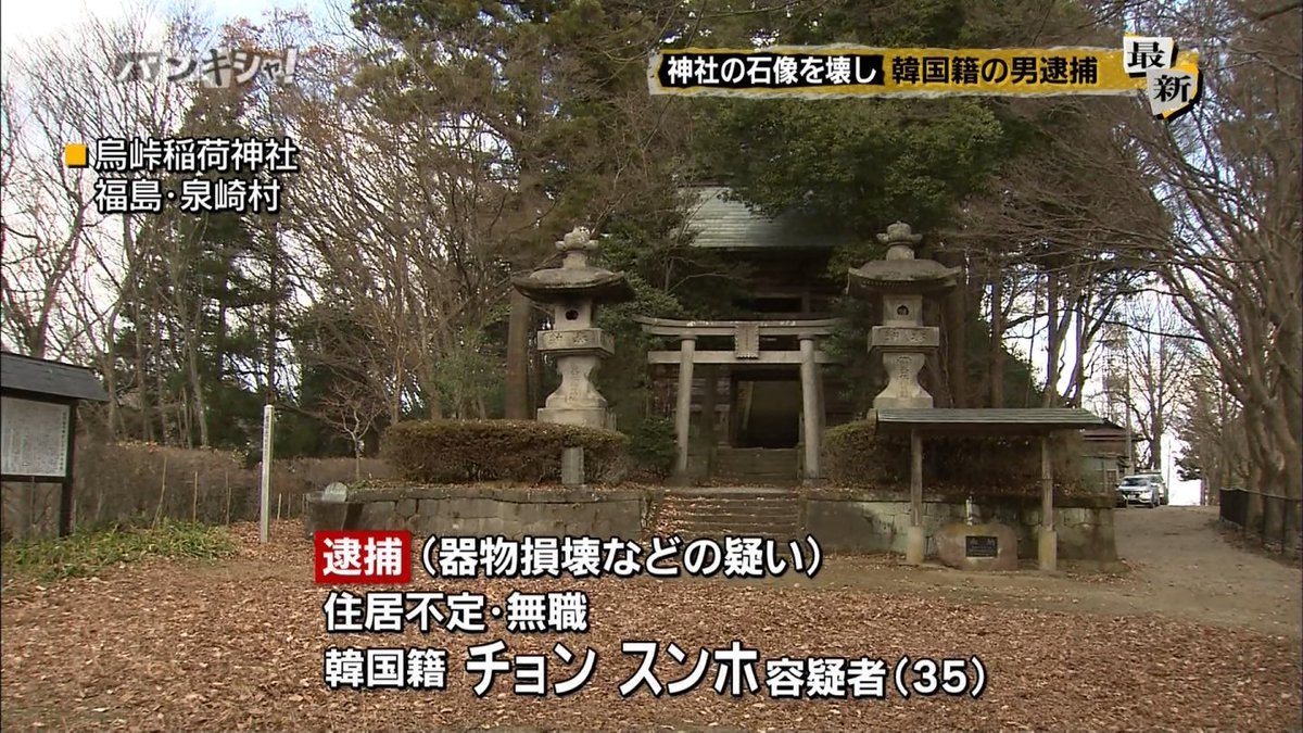 福島県警白河署は10日、同県泉崎村の神社でキツネの石像などを壊したとして、器物損壊と建造物侵入の疑いで、住所不定、韓国籍の無職チョンスンホ容疑者(35)を逮捕した。