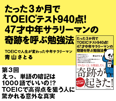 たった3か月でTOEICで高得点を取る方法。辞書は引かない、スペルは書かない、仲間は作らない、単語の暗記は1000語だけ。『たった3か月でTOEICテスト940点! 47才中年サラリーマンの奇跡を呼ぶ勉強法』の著者に聞く、オキテ破りの勉強法の連載3回目です。