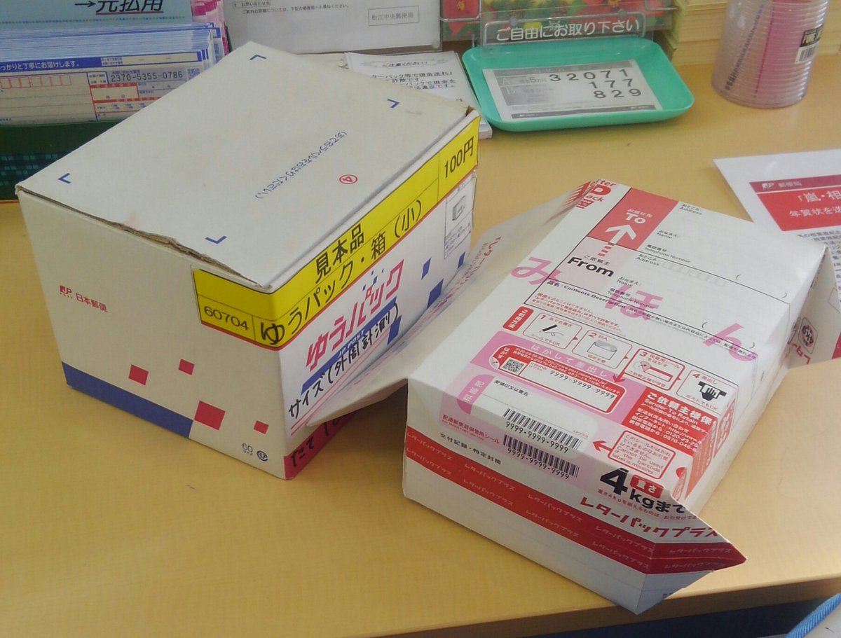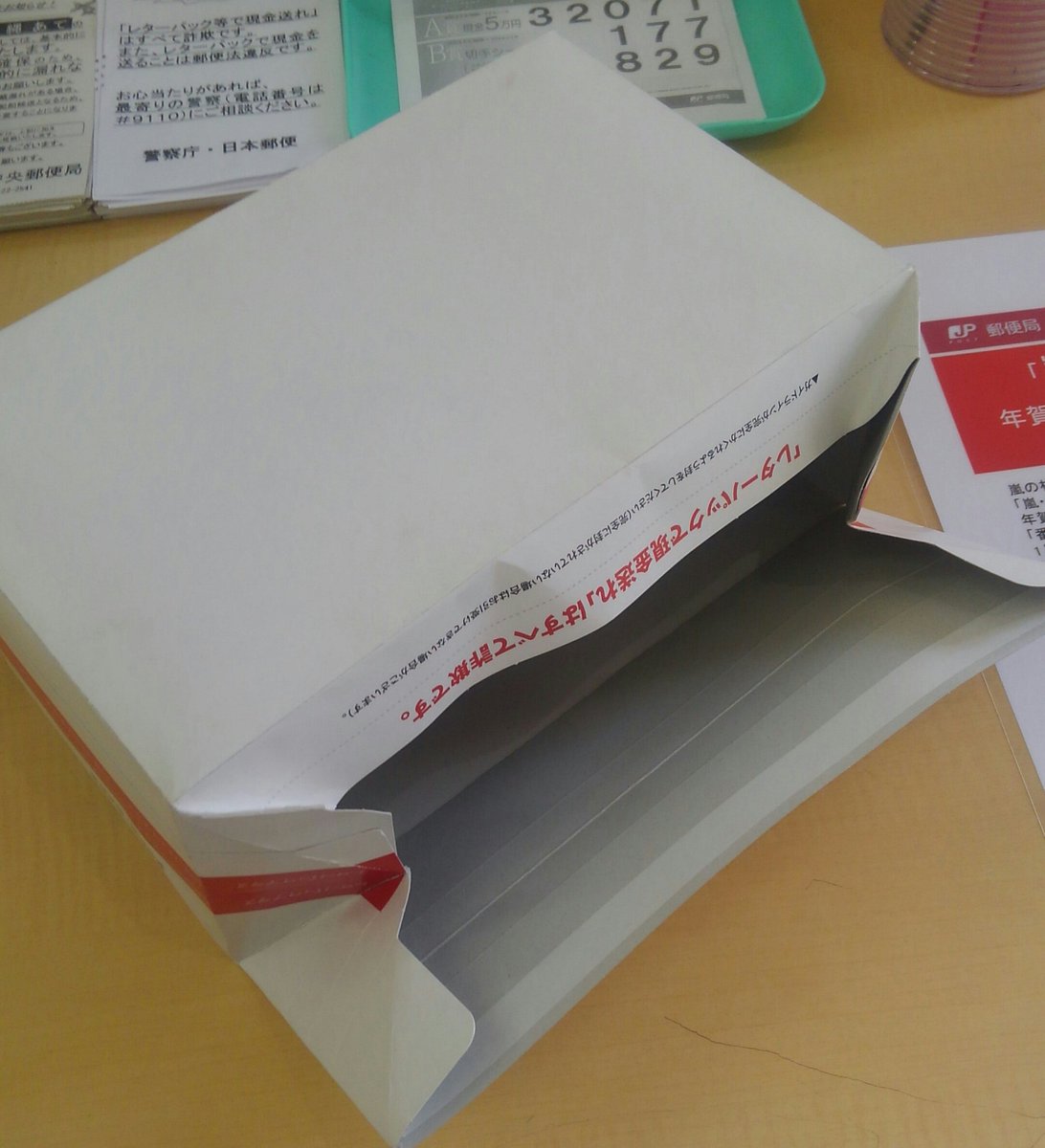 今更かもしれんけど、レターパック510を箱形にする思い切ったやり方が郵便局にあって衝撃を受けた。ゆうパック最小サイズより一回り小さい箱になってた!これ使えるわ・・・。封筒の紙が破れなければ・・・。 pic.twitter.com/dBjnbAtbFB