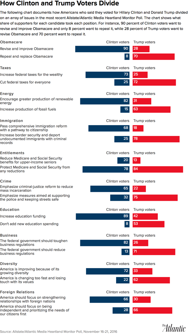 Based on assessments of his transition, Trump’s initial approval among Democrats probably won’t reach much into double-digits—and he could also begin with less-than-majority approval from Independents, a first in Gallup surveys. And as the latest Allstate/Atlantic Media Heartland Monitor Poll found, many key elements of Trump’s agenda—including prioritizing fossil-fuel production over renewable energy and rolling back federal regulatory protections—face overwhelming opposition from Americans who did not vote for him. Cutting entitlements for seniors could deeply antagonize not only his opponents, but also his base.