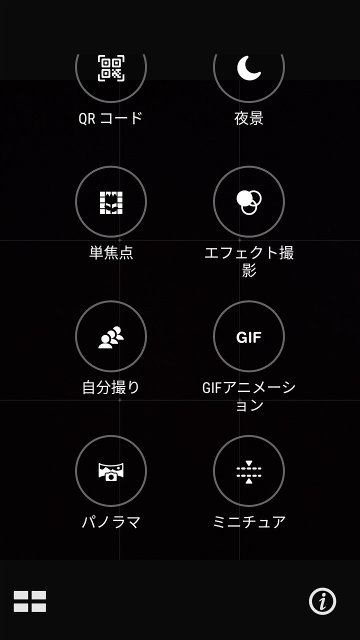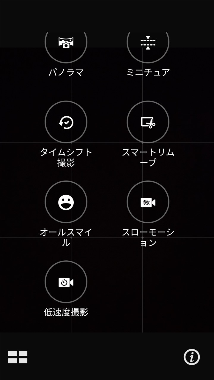 マニュアルモードでは、ホワイトバランスやシャッター速度、ISOなどを手動で変更可能。またその他のモードは、縦持ちで左下にあるボタンから。オートやマニュアルを含めると、夜景や単焦点、ミニチュア、パノラマ、タイムシフト、オートスマイルなど21種類が用意されています。