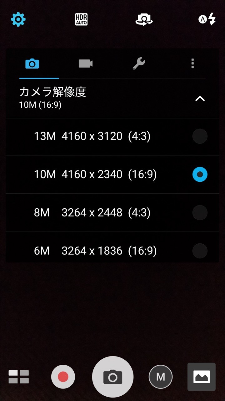 リアカメラの撮影サイズは、標準で16;9の10M(4160×2340ピクセル)となっていますが、最大撮影サイズは4:3で13M(4160×3210ピクセル)です。また標準カメラアプリでは保存形式はJPEG形式のみでこちらは初期状態で「ファイン」になっています。