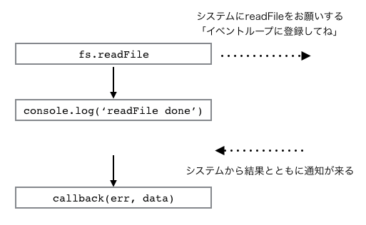 Node.jsの標準の実装は、多くの場合この形式のAPIで提供されています。引数に、コールバック関数と呼ばれるクロージャを渡し、それをイベント度に呼び出すAPIデザインのことです。上述で使った次の形のAPIですね。