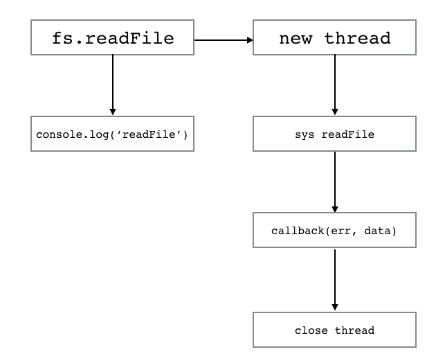 そして、fs.readFileは定期pollによって1イベントを監視するイベント処理を投入するのです。もっと簡単に言えば、大体のI/O操作はシステム(OS)に任せることができ、readFileなどの操作はシステムに任せきることで、Node.jsでは本来の処理に戻り、システムから通知があった段階でコールバックを走らせるということを行います。これはループ処理によってキューがなくなるまで行われる上のような循環図になりますが、誤解を恐れずもっと分かりやすく書くなら、以下のような処理になっているということです。
