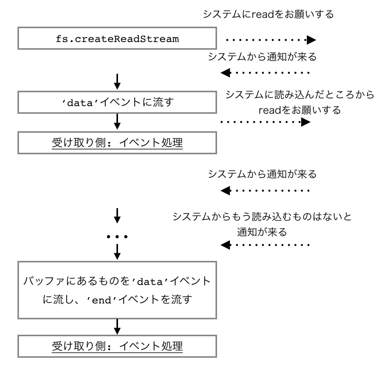 - イベントループにイベントは投げられますが、読み込みが終わった後もストリーム内のバッファにデータは保持されます
