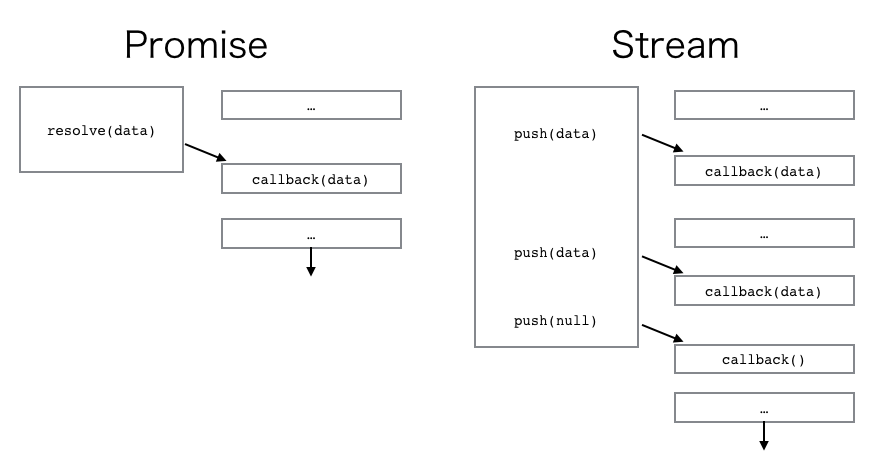 また、もう一つの問題として使いにくさがあります。非同期コールバック、Promise、async/awaitと進化していった、一つの出力を持つ非同期体系に対し、Node.jsのStream APIは簡単に操作できるものではありませんし、様々なライブラリをimportする必要が出てきます。また、分岐や取得タイミングの調整についても、暗黙的な動作を採用してしまったために、かえって適切に調整することが難しくなっています。