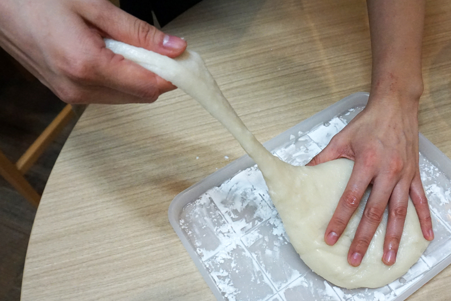 自分で大福を作れば、あんこの量も自由。市販されている大福とは比べ物にならないぐらいたっぷり入れてみました。この頃には餅はけっこう冷めていたのですが、まだまだ伸びます!