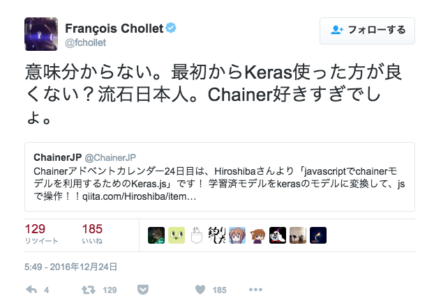 Keras作者がなぜかこのツイートだけ日本語でChainerを煽っている