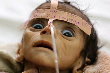 Infant Udai Faisal is hospitalized for acute malnutrition the Al-Sabeen Hospital in Sanaa, Yemen, on March 22. Udai died on March 24. Hunger has been the most horrific consequence of Yemen’s conflict and has spiraled since Saudi Arabia and its allies, backed by the U.S., launched a campaign of airstrikes and a naval blockade a year ago. Maad Al-zikry / AP