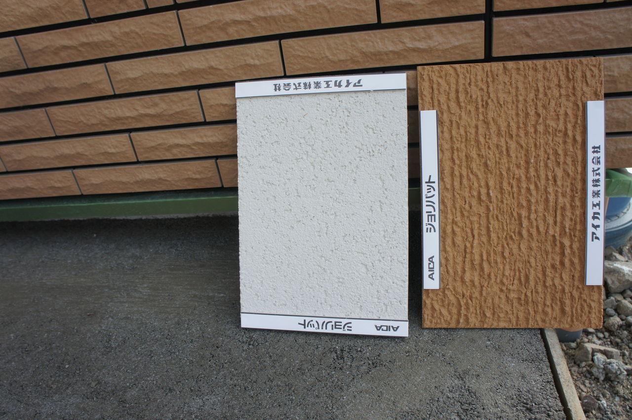 当初は外壁のオレンジに合わせて門柱もオレンジにしようかと思っておりましたが(下の写真に写っているサンプルの色合いです)、この色だと安っぽく見えそうで心配でしたので、最終的に無難に白色にしました^^