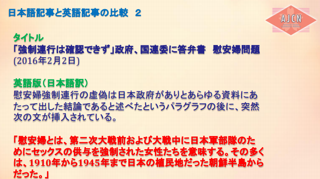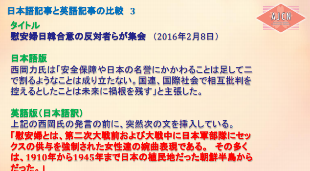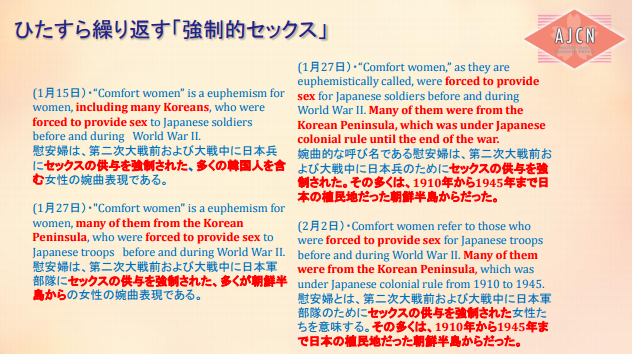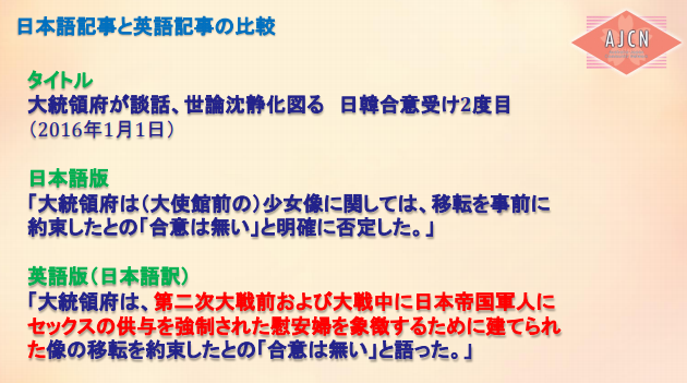 なぜ、こんな単一的な報道になるのだろう、と不思議に思って調べてみたら、オーストラリアで慰安婦像設置に反対する団体、AJCNの代表、山岡鉄秀氏の資料を発見した。 ここで一部を引用したい。