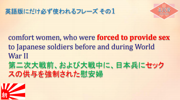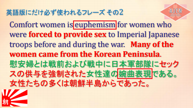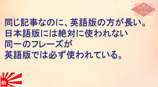 朝日新聞は、慰安婦の強制連行を強く暗示しておきながら、決して「性奴隷」という言葉を使わない。2014年に吉田証言を訂正・謝罪した時、朝日の第三者委員会で「性奴隷」という表現が問題視されたからだ。だが、その代わりに、「慰安婦」という言葉が”euphemisum”(婉曲表現)であるという但し書きを入れる。慰安婦が「婉曲表現」なら、直接表現とは、何か?「性奴隷」しかない。朝日は、『本当は性奴隷と書きたいけれど、日本人が五月蠅いので、「慰安婦」ってことにしておきますよー』と言いたいのだろう。日本の世論なんか怖くない欧米メディアがこれを読めば、当然、直接表現である「性奴隷」を使おうとする。彼らの記事を読むと、「性奴隷」のオンパレード。慰安婦像は「性奴隷像」、慰安婦合意は「性奴隷合意」という具合に、意味もなくこれでもかと繰り返しているのだ。