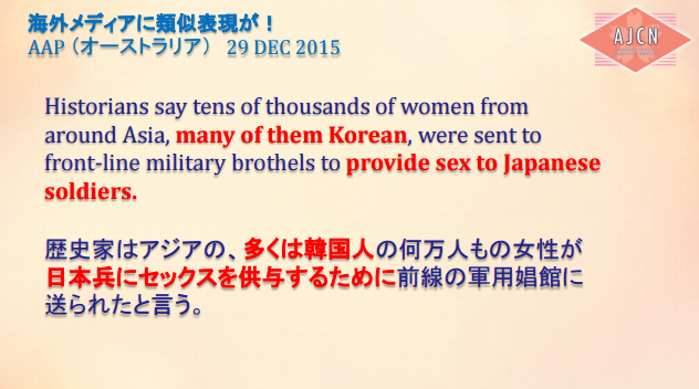 プサンの慰安婦像問題を報じる欧米メディアが、どの社も判で押したように全く同じであることへの疑問。”comfort women”はカッコ付きで、「婉曲表現」という但し書きがつき、慰安婦問題を全く知らない読者を洗脳するかのように、「セックスを強要された女性」と説明される。「誰に」が不明瞭であり、朝鮮人業者や娘を売った親に関する説明がないため、日本軍による強制連行を強く暗示している。そして、「性奴隷」というレッテル貼りのオンパレード。