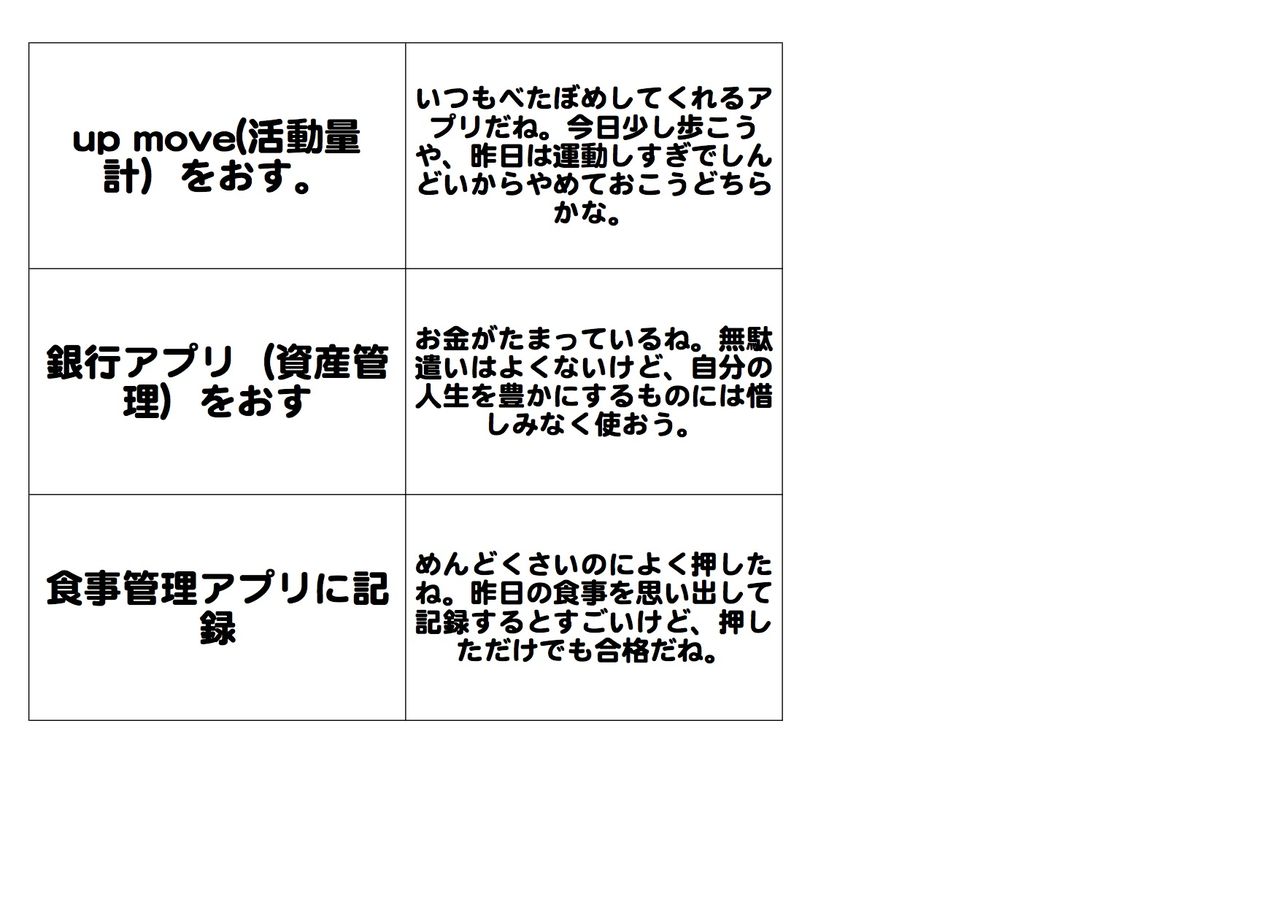 - 食事管理アプリに記録(食べたものがわかるから、手入力なのでみないことも多い。だから追加)