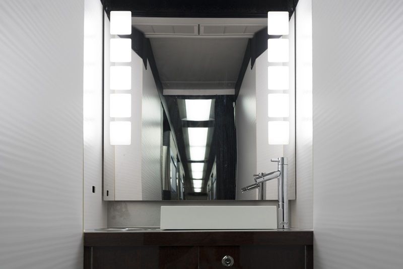 パウダールームには、揺れる車内でも安心して使えるよう収納式の椅子があり、鏡の両端にはLED照明を
